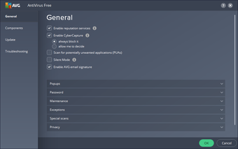 AVG AntiVirus имеет темный, эстетичный и стильный интерфейс с черным фоном и зелеными элементами. Четкие признаки работоспособности компьютера легко обнаружить в виде галочки или предупреждения. Можно настроить и запланировать полное глубокое сканирование или выполнить более быстрое сканирование меньшего размера с удобной навигацией по программе. Ссылки на другие разделы, такие как MyAVG, ведут к более глубоким персонализированным разделам приложения и позволяют выполнять дальнейшую настройку.
